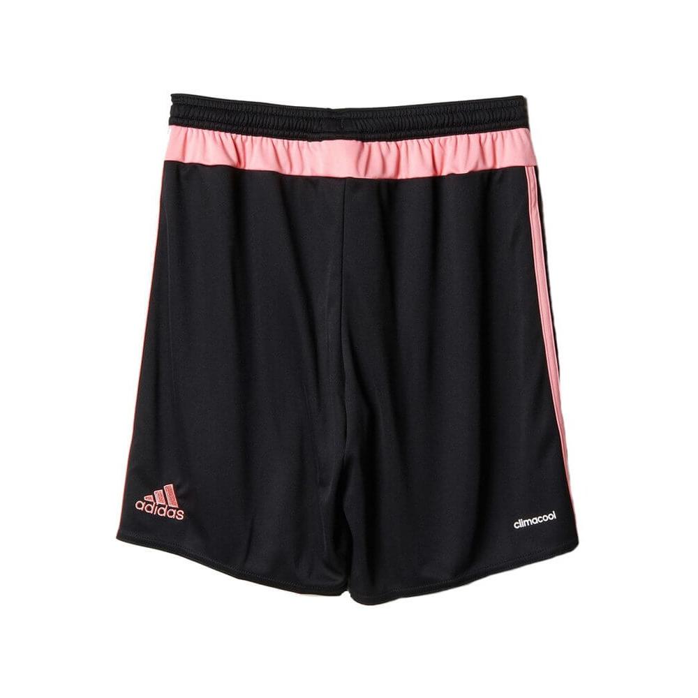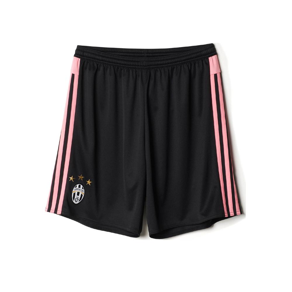 Il taglio è in colore nero con le strisce Adidas rosa su entrambi i lati, una striscia rosa sul retro sotto il bordo superiore e lo stemma del Juventus FC sormontato dalle tre stelle dorate nella parte destra. 100% poliestere