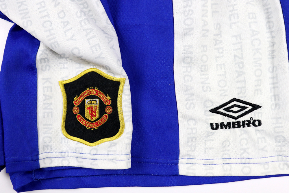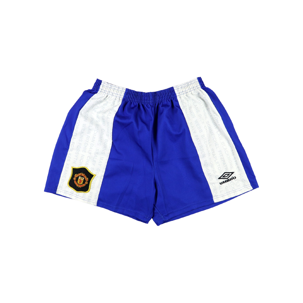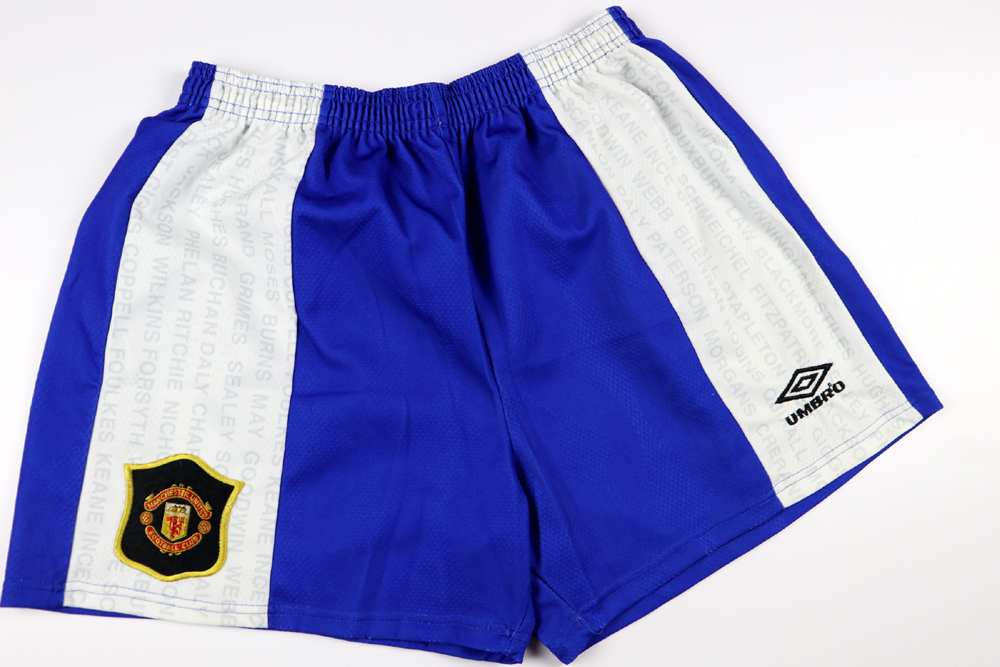 Note: Storici pantaloncini del Manchester United con la quale i Red Devils vinsero la Premier League e la FA cup nella stagione 1995-96