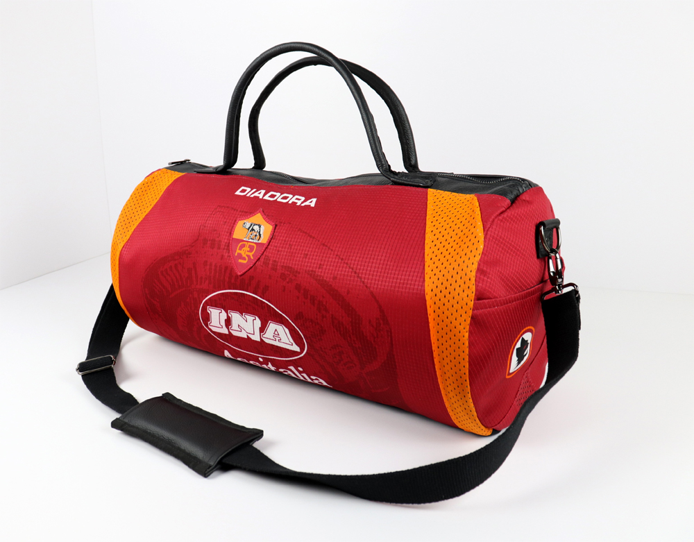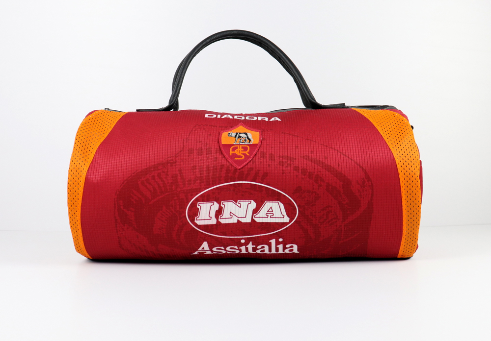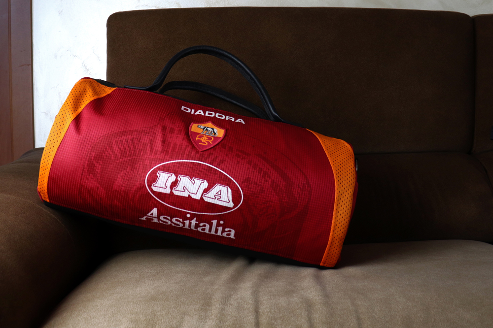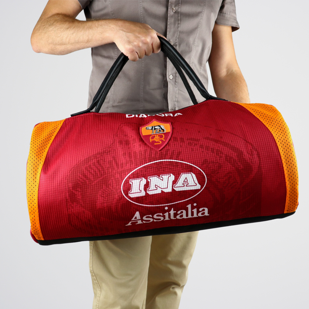 Questa borsa è realizzata con la maglia originale della As Roma 1997-98.