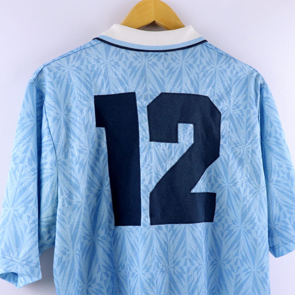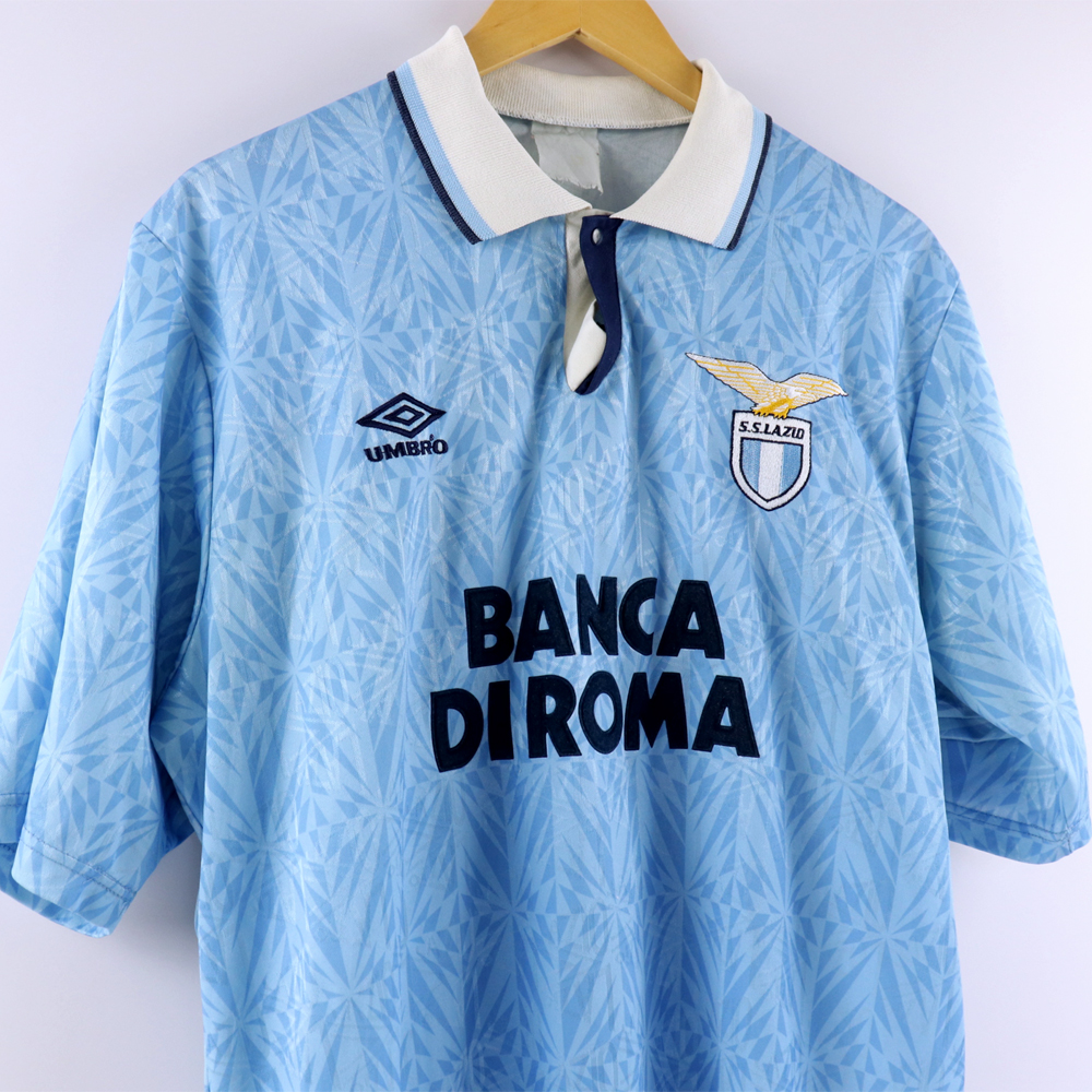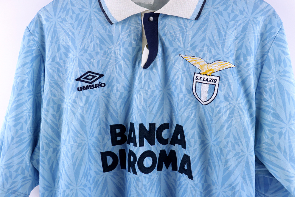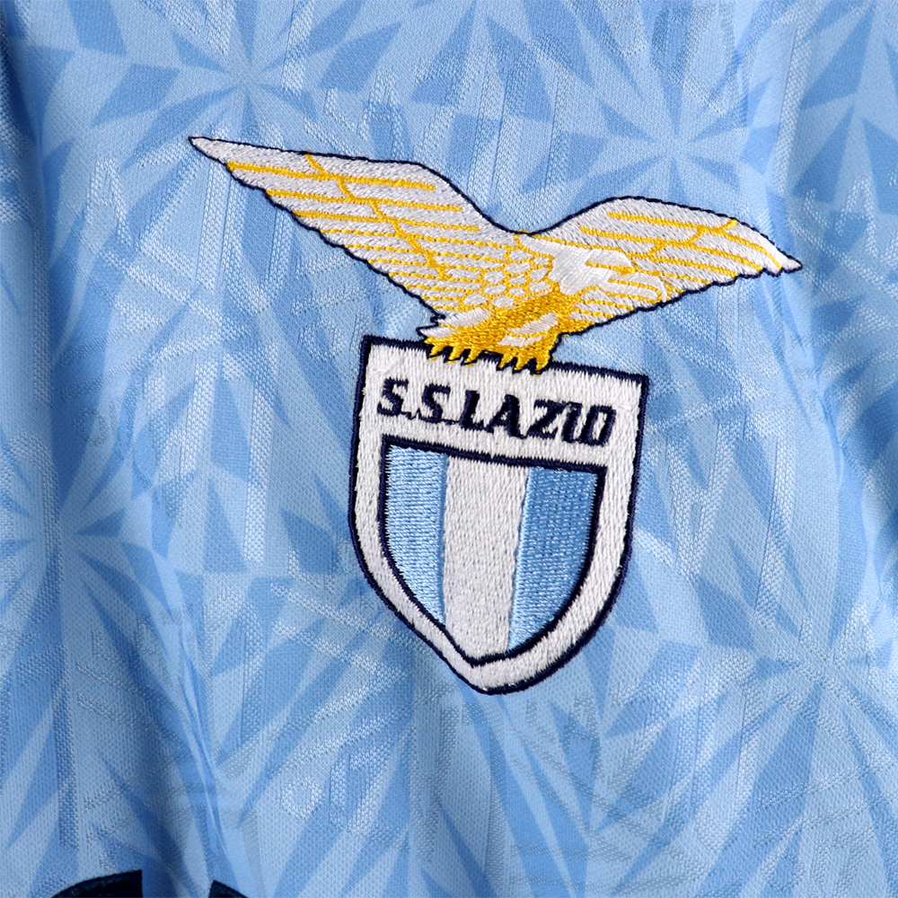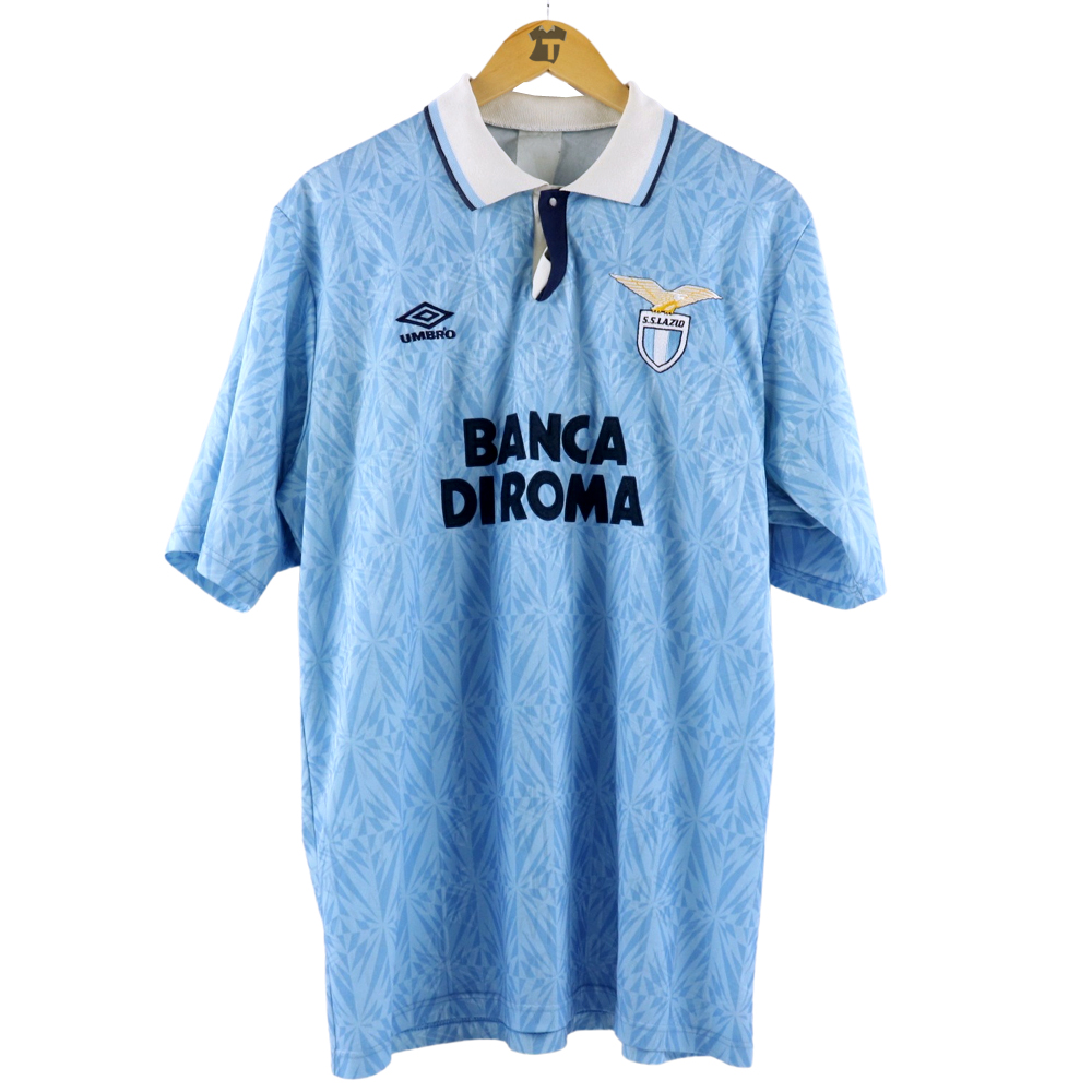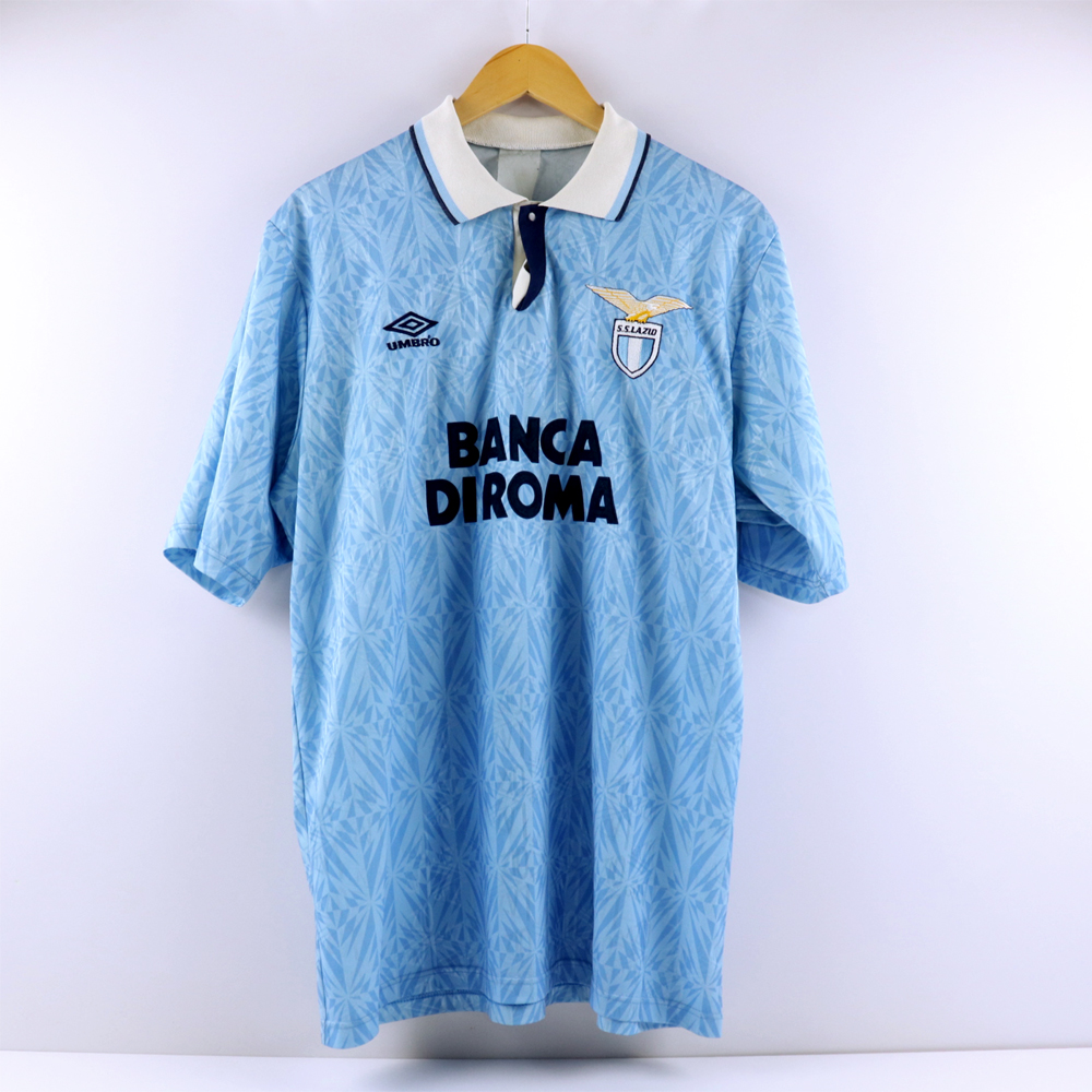 Dettagli: Logo Umbro e Lazio ricamato. Sponsor Banca di Roma in flock, applicato. Numero cucito a macchina a zig-zag. Maglia Lazio indossata in partita amichevole durante la stagione 1992/93.