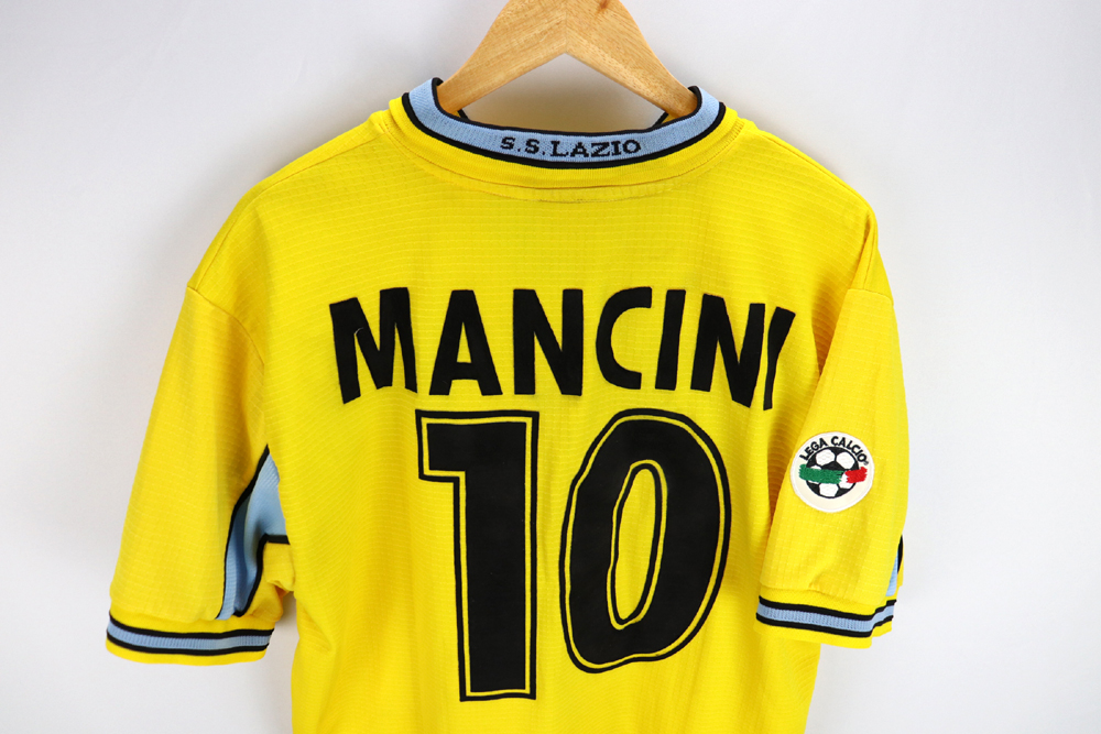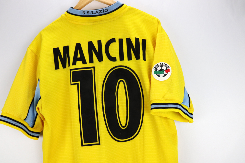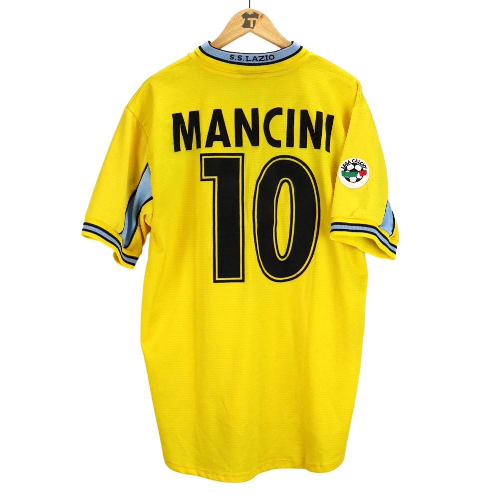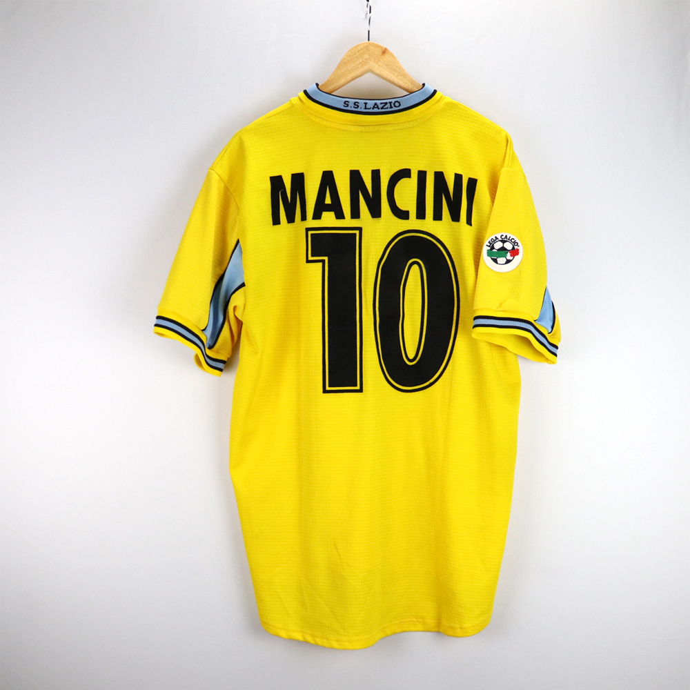 Dettagli: Loghi Puma e sponsor Cirio in flock, applicati. Logo Lazio ricamato. Nome-numero in flock, applicati. Patch lega calcio sulla manica destra.  Maglia gara Lazio preparata per Roberto Mancini per la stagione 1998-99. Le maglie indossate/match worn non presentano la targhetta "Puma official merchandise" in basso a destra, sul fronte della maglia.