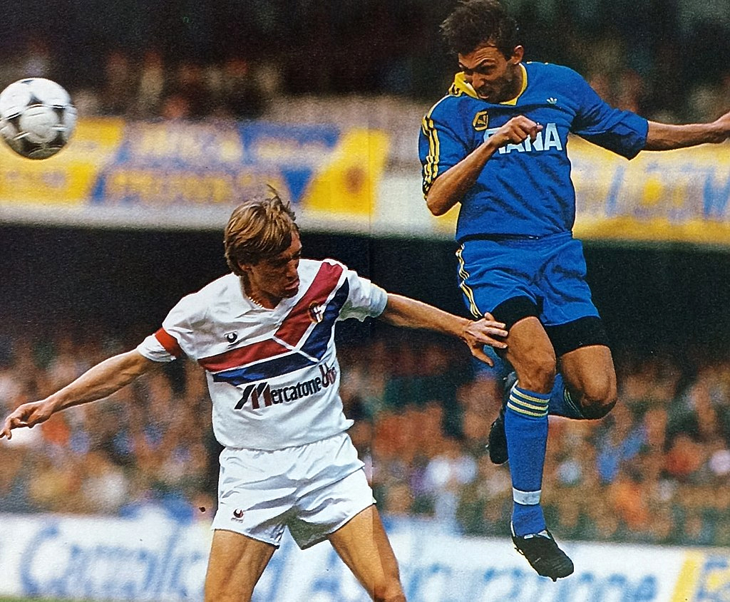 Note: Il Bologna nella stagione 1989-1990 partecipa al campionato di Serie A, classificandosi all'ottavo posto con 34 punti. Per la terza stagione di fila è allenato da Luigi Maifredi, nella prima ha ottenuto la promozione dalla Serie B, nella seconda stagione ha ottenuto il 14º posto nella massima serie, in questa annata ha centrato l'ottava piazza, raccogliendo 18 punti nel girone di andata e 16 punti nel girone discendente, con l'ottava posizione a 34 punti ha anche ottenuto l'ultimo posto disponibile per la qualificazione alla Coppa UEFA 1990-1991