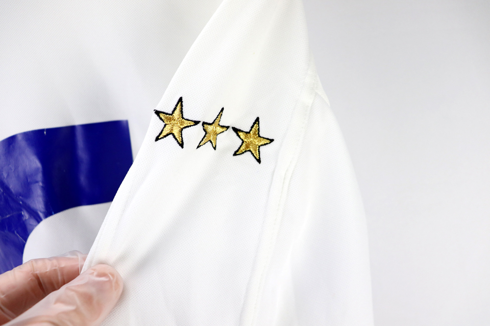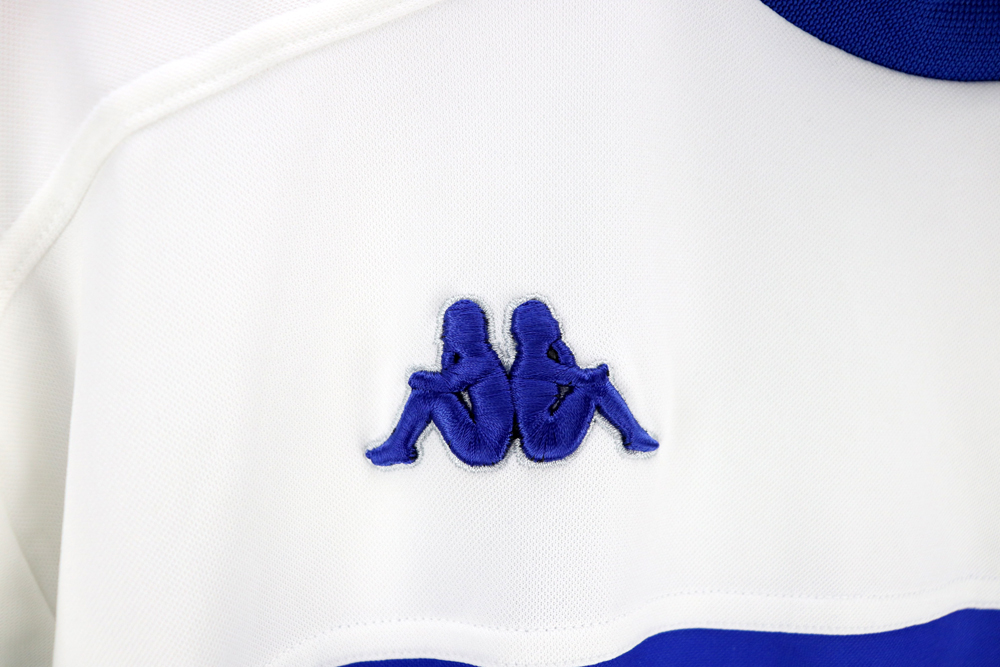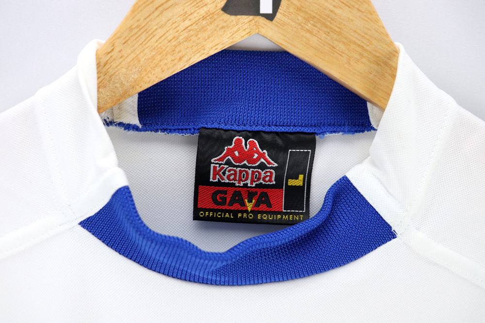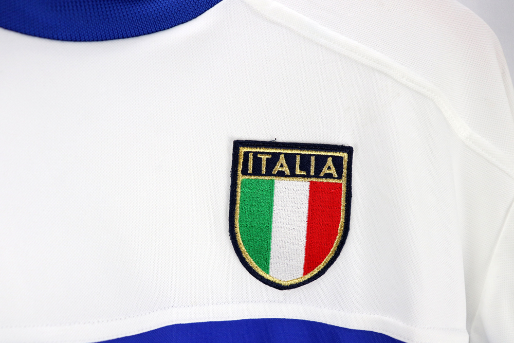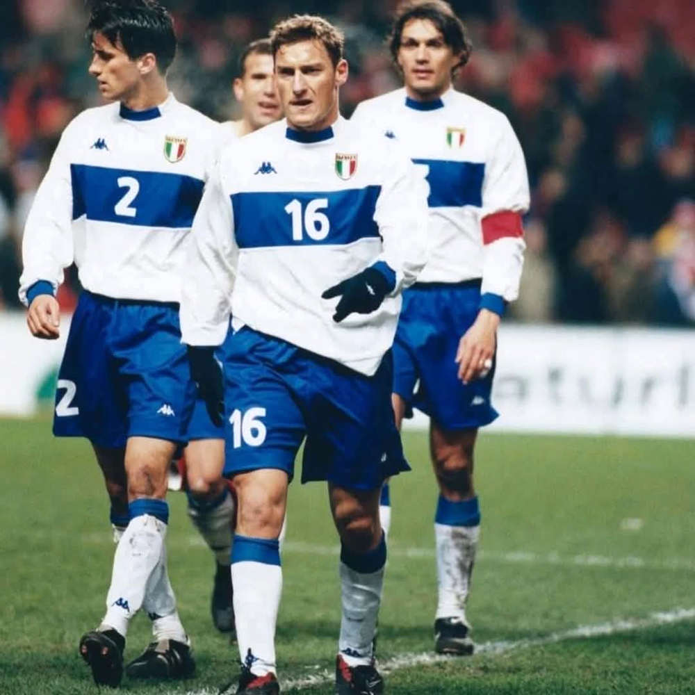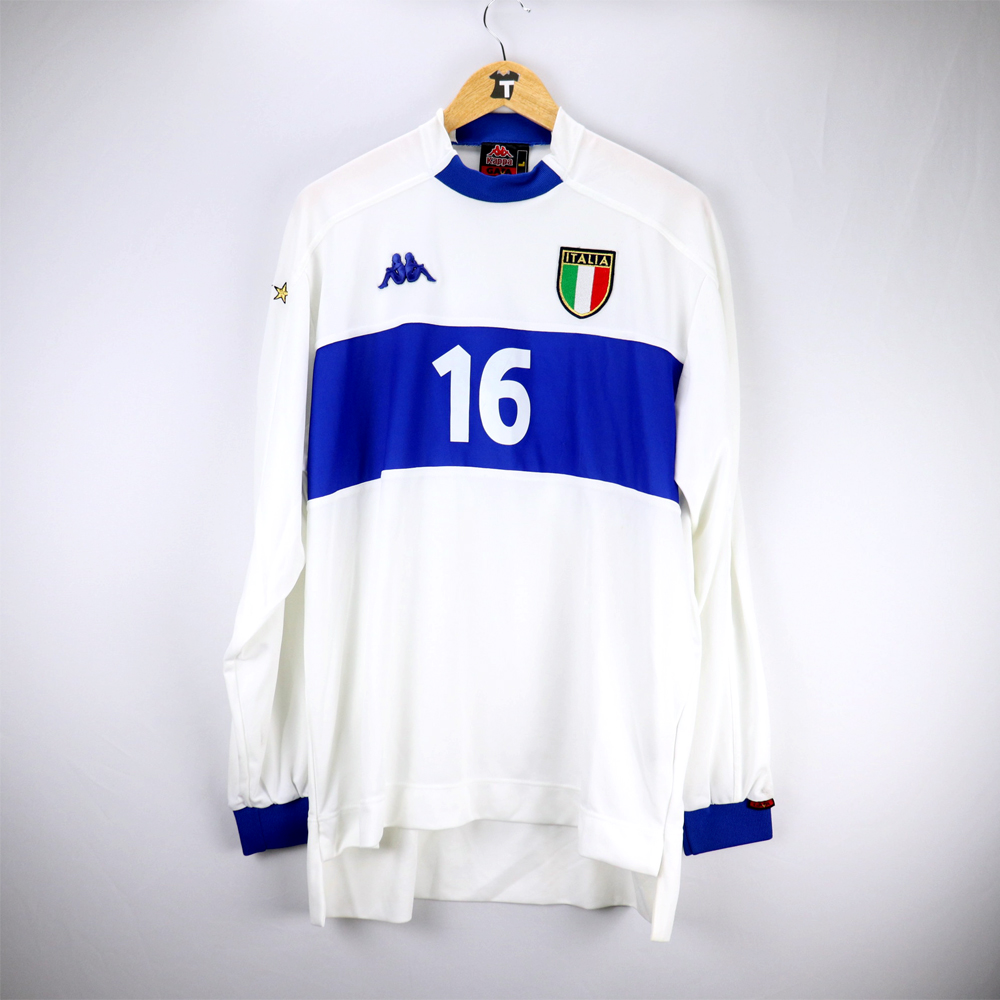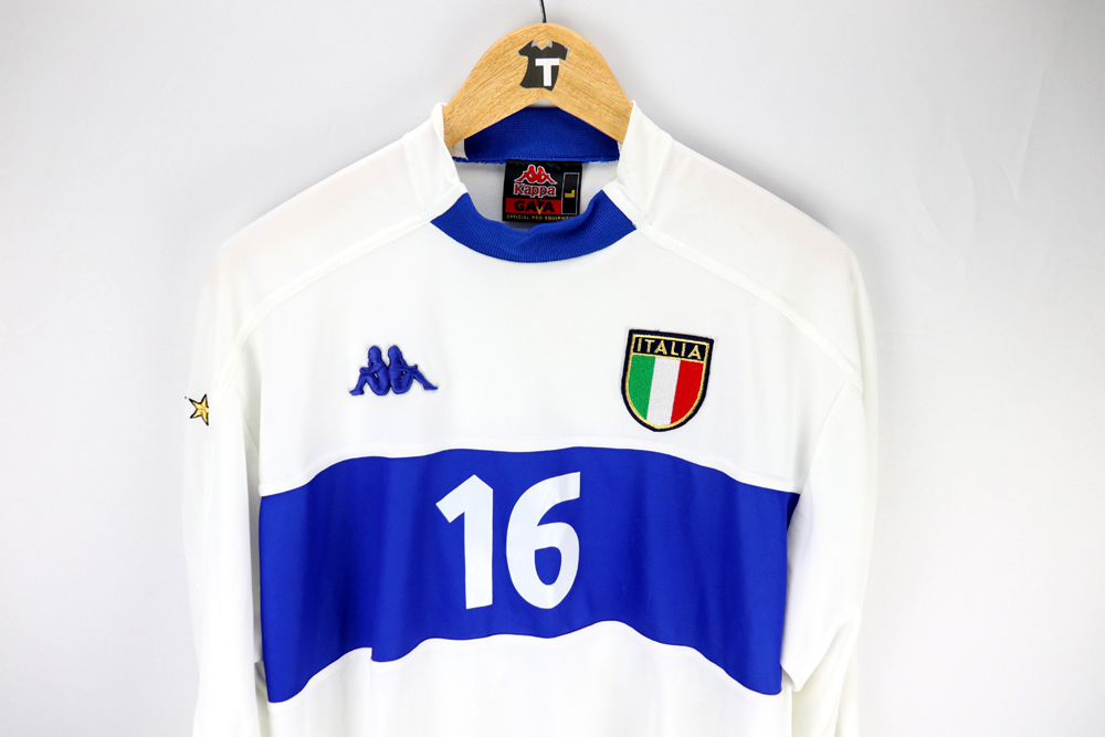 Dettagli: Logo Kappa e stemma Italia ricamati. Numero in plastica, applicato. Stelle sulla manica destra ricamate. Maglia nazionale italiana come quella utilizzata da Francesco Totti nella partita Danimarca vs Italia del 27 marzo 1999.