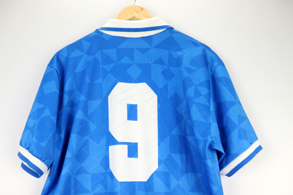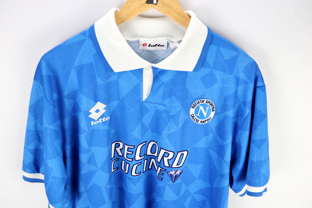 Dettagli: Logo LottoSport ricamato. Stemma napoli cucito. Numero e sponsor Record Cucine stampato all'interno del tessuto ( in trama ). Maglia Napoli indossata durante la stagione 1994/95. Il numero 9 è stato utilizzato prevalentemente da Massimo Agostini
