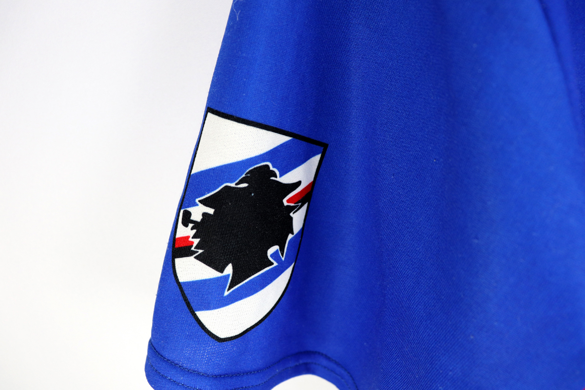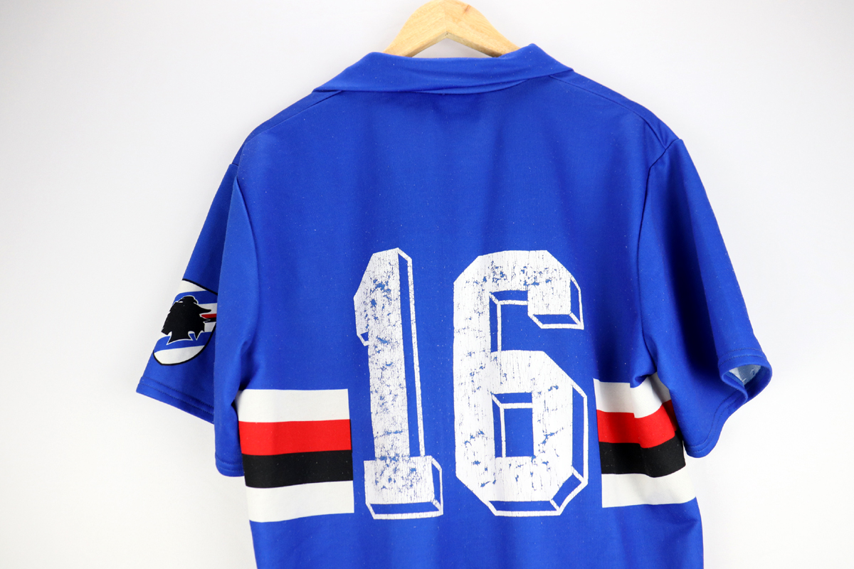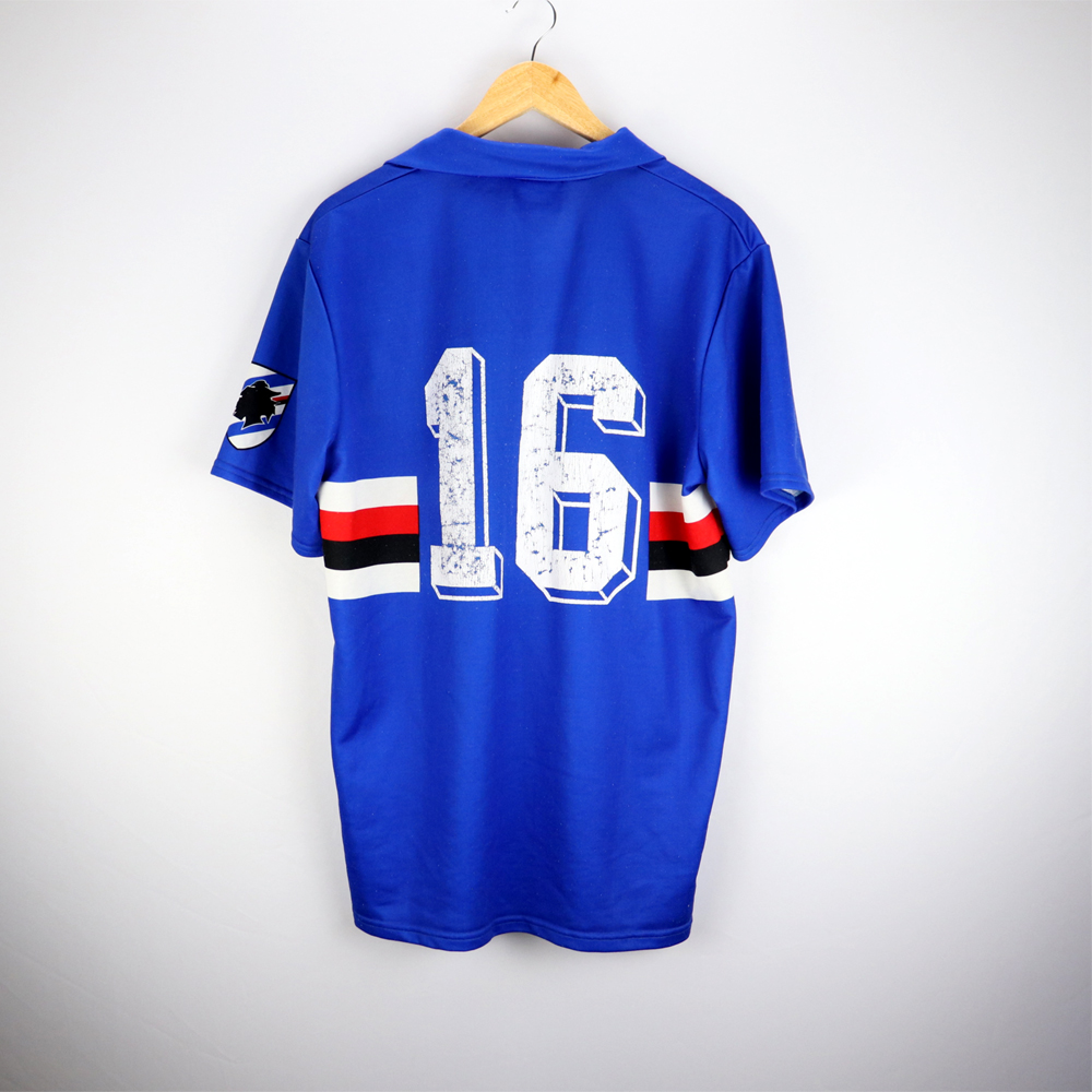 Dettagli: Logo Kappa ricamato. Sponsor erg stampato nel tessuto. Logo Sampdoria stampato nel tessuto. Coccarda tricolore cucita. Numero applicato con segni di usura. Maglia Sampdoria indossata nella stagione 1989-90. Il numero 16 è stato utilizzato prevalentemente da Fausto Salsano