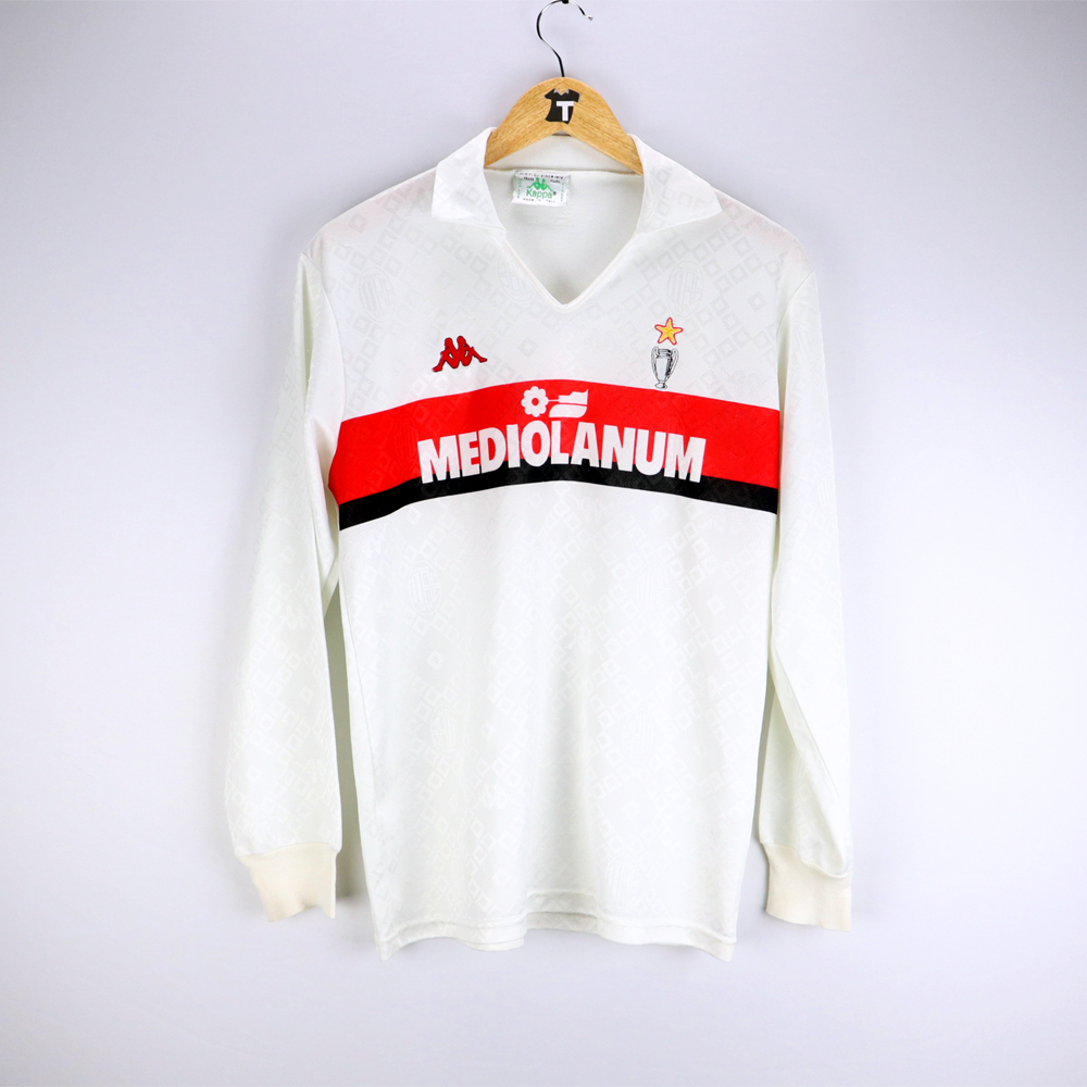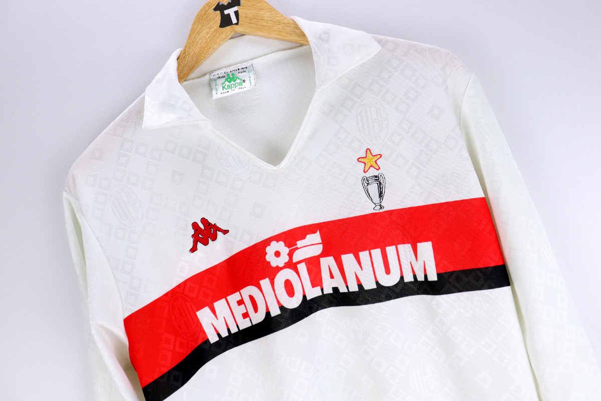 Note: La maglia della trionfale stagione 1989-90. I rossoneri oltre al 2° posto in Serie A e la finale di coppa italia, vinsero la Coppa dei Campioni, la Supercoppa Uefa e la Coppa Intercontinentale.