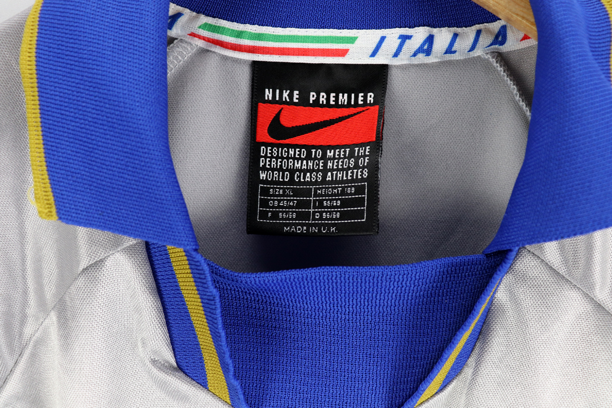 Dettagli: Stemma Italia FIGC e logo nike ricamato. Maniche tagliate, stile Angelo Peruzzi ad Euro 96. Maglia in eccellenti condizioni.  Da ascella ad ascella 62 cm. Lunghezza 77 cm.