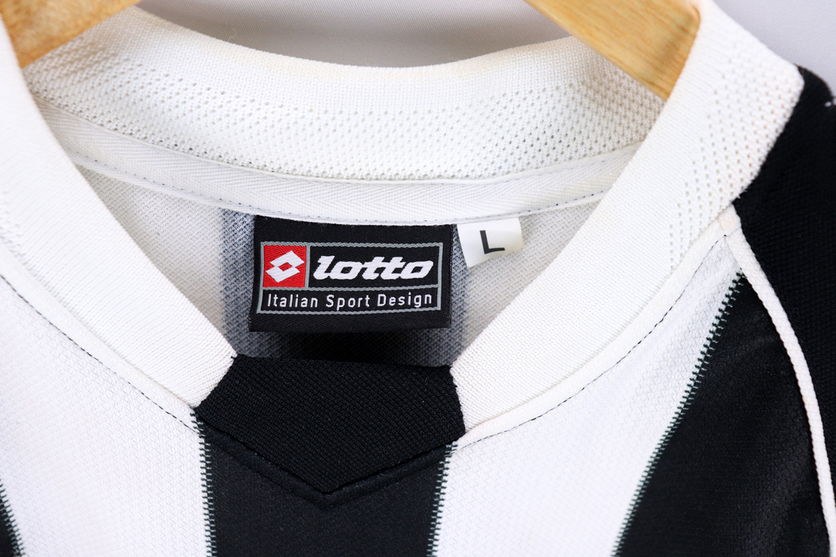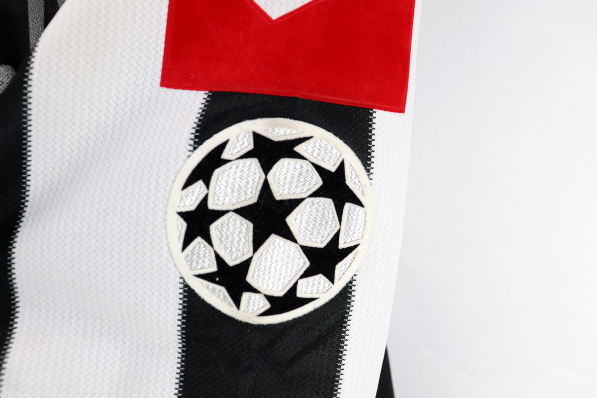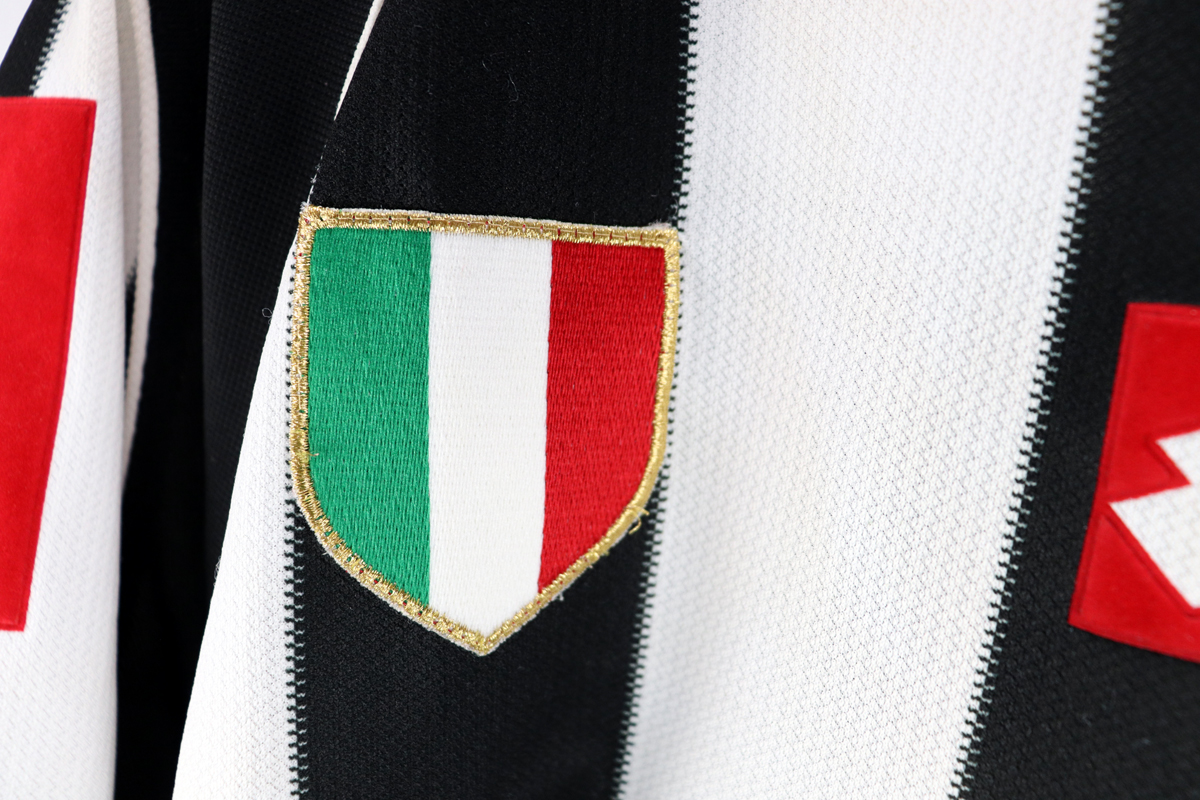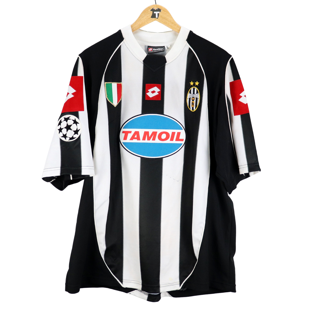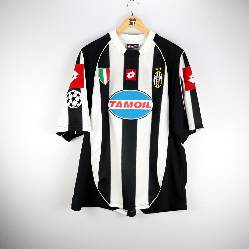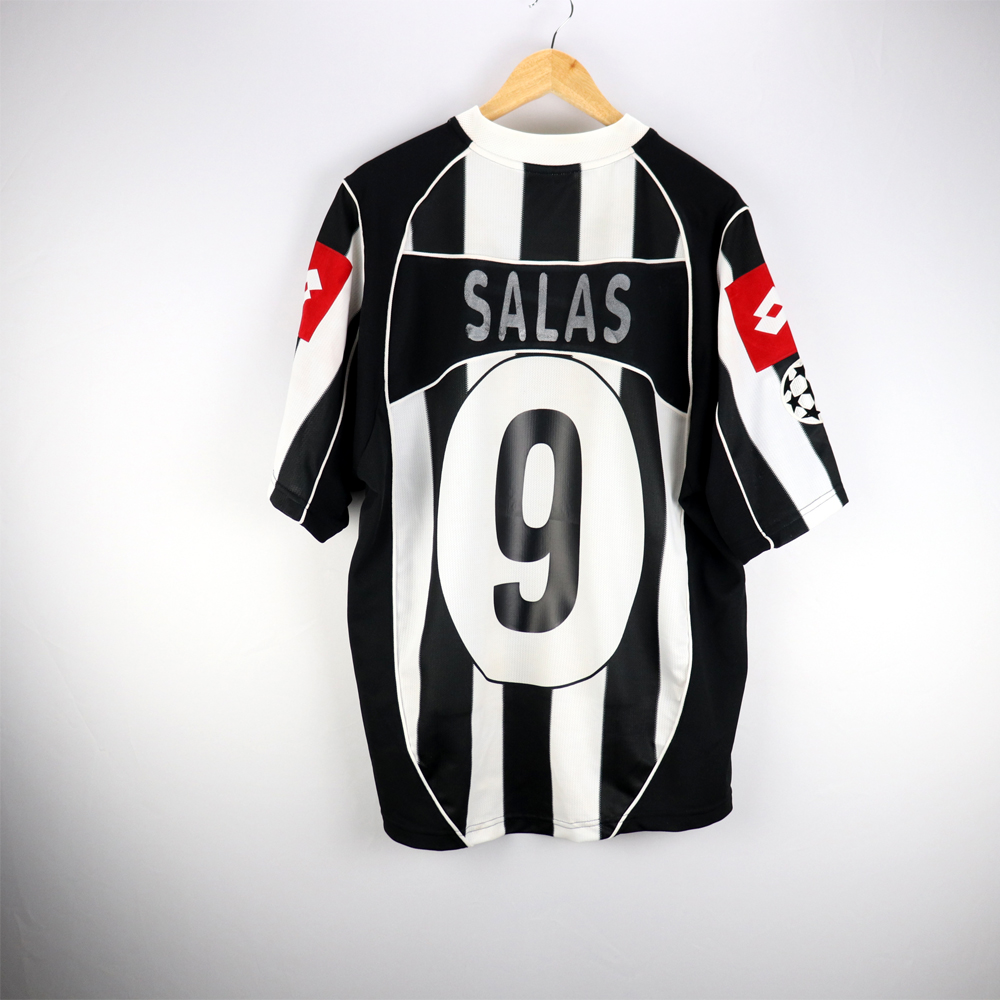 Dettagli: Logo Juventus ricamato. Name set Salas 9 applicato. Si differenzia dalle replica vendite nei negozi per: Assenza della targa sul fondo sinistro della maglia Prodotto ufficiale juventus FC lotto ed etichetta della taglia ed etichetta lotto cucite nel colletto e non un unica placchetta applicata in plastichina. Per la Champions league è stato usato sulle maniche un logo Lottosport di dimensioni ridotte. Patch Champions League applicata. Sponsor Tamoil. Maglia gara Juventus preparata/indossata per la Champions league 2002/03