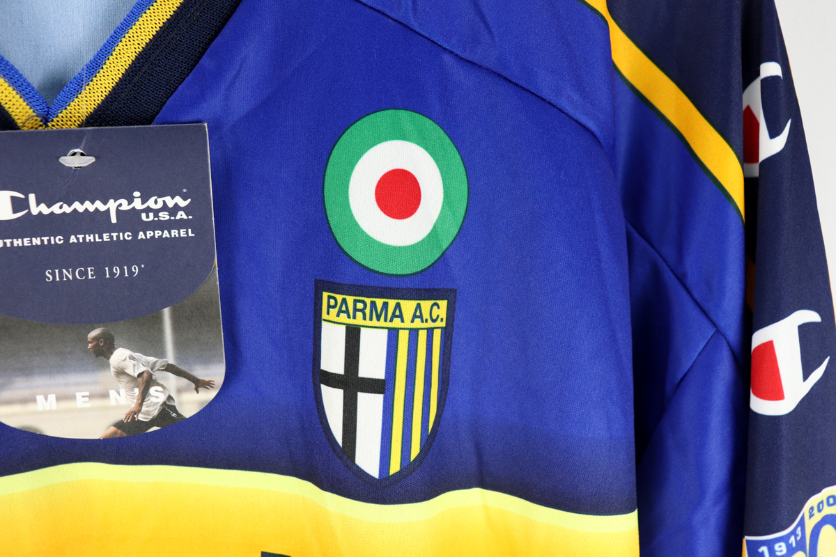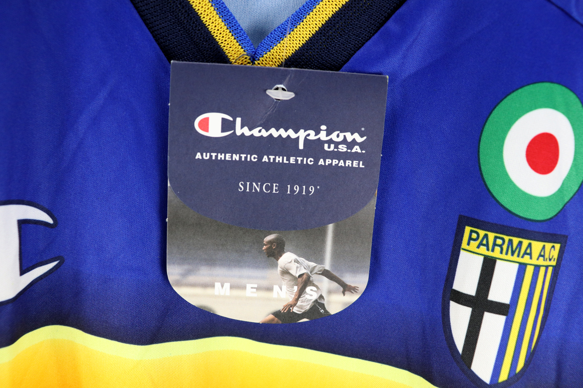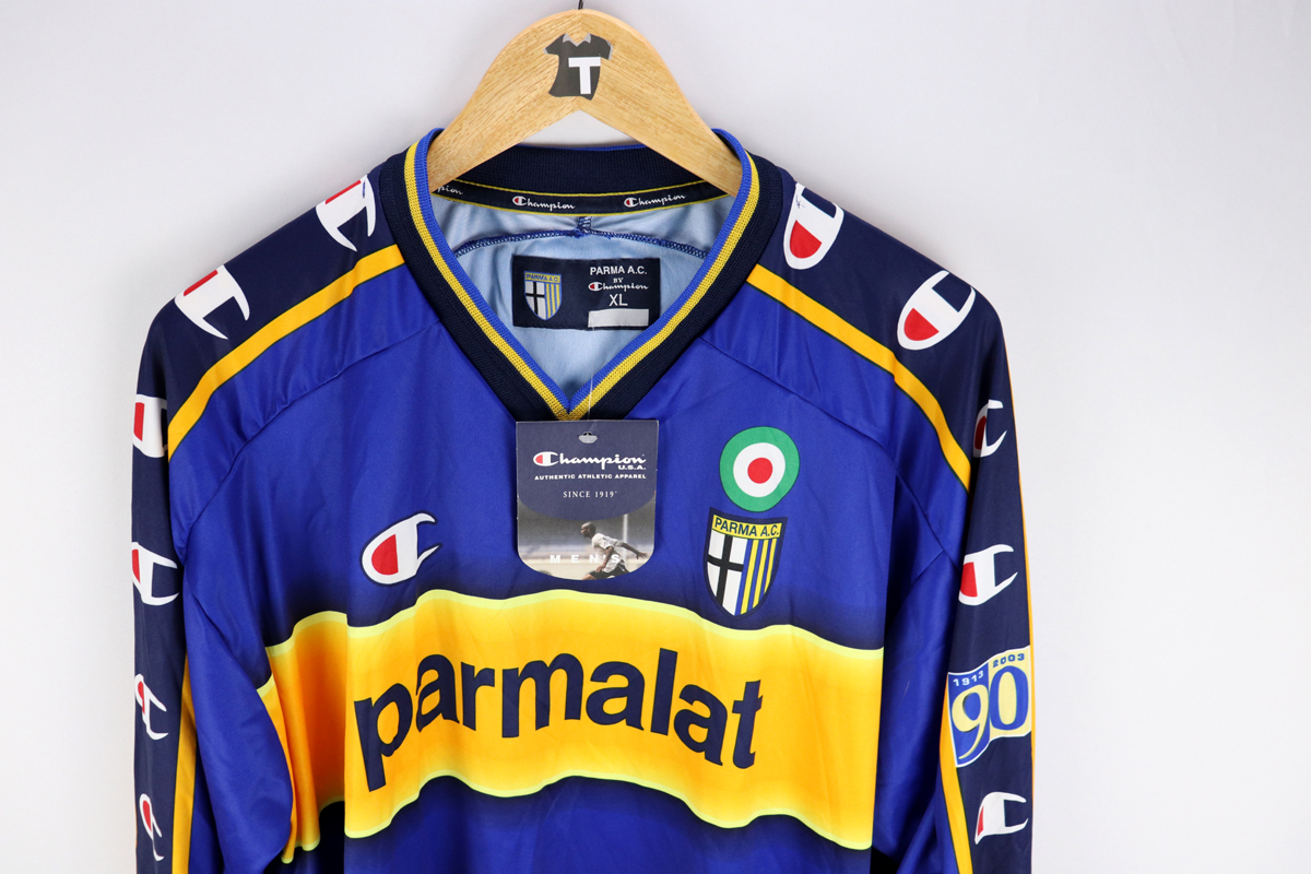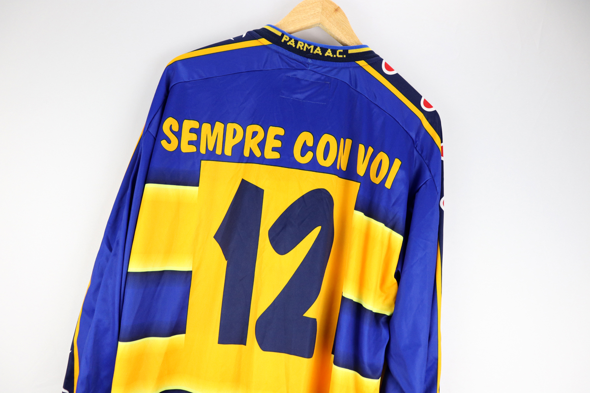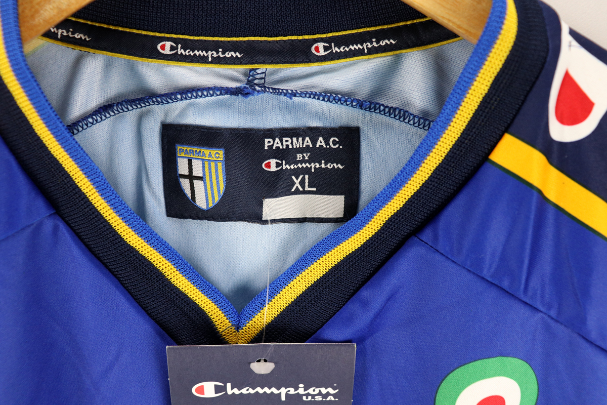Dettagli: Logo Champion e stemma Parma stampati. Sponsor Parmalat stampato. Numero 12 Sempre con voi stampato. Maglia nuova con cartellini. Da ascella ad ascella 59 cm. Lunghezza 78 cm
