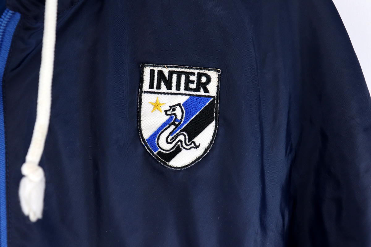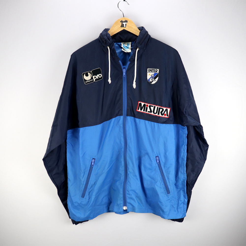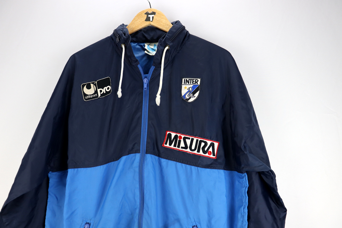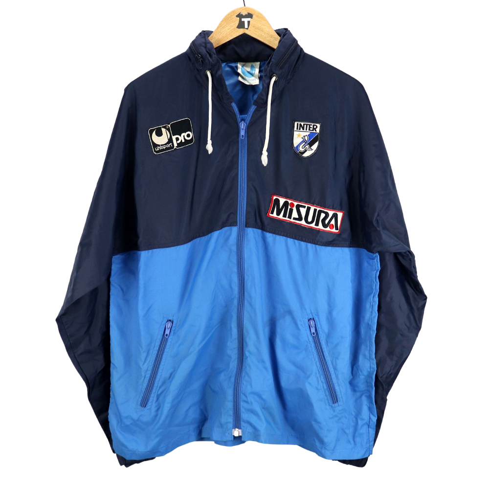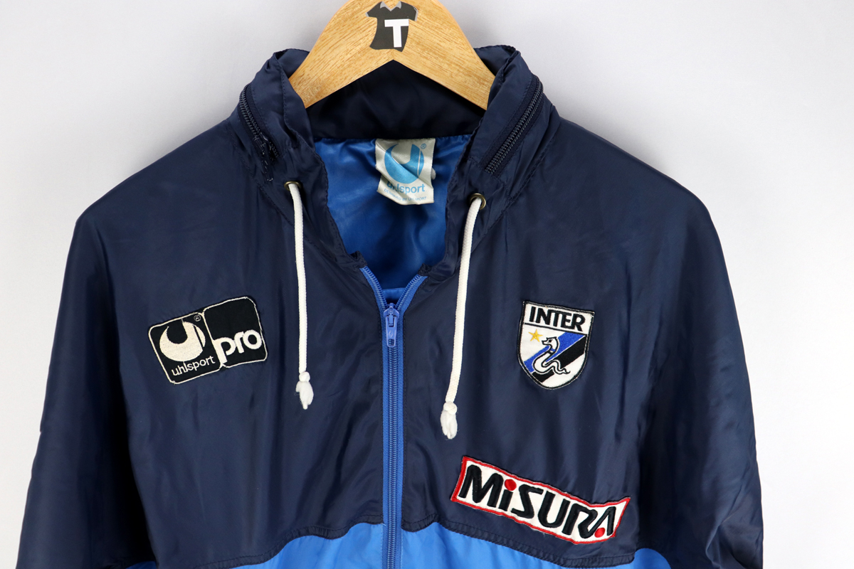 Dettagli: Logo Uhlsport e stemma Inter cuciti. Sponsor Misura cucito. K-way in eccellenti condizioni. Nel colleto è indicata taglia Small ma vestibilità abbondante. Da ascella ad ascella 57 cm. Lunghezza 73 cm.