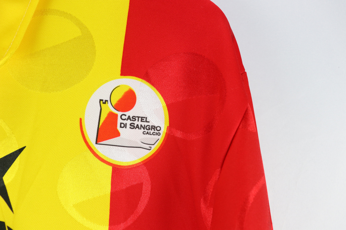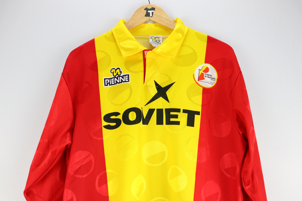 Dettagli: Stemma Castel di Sangro, logo Pienne e sponsor Soviet stampati in trama. Maglia in eccellenti condizioni. Da ascella ad ascella 57 cm. Lunghezza 74 cm.