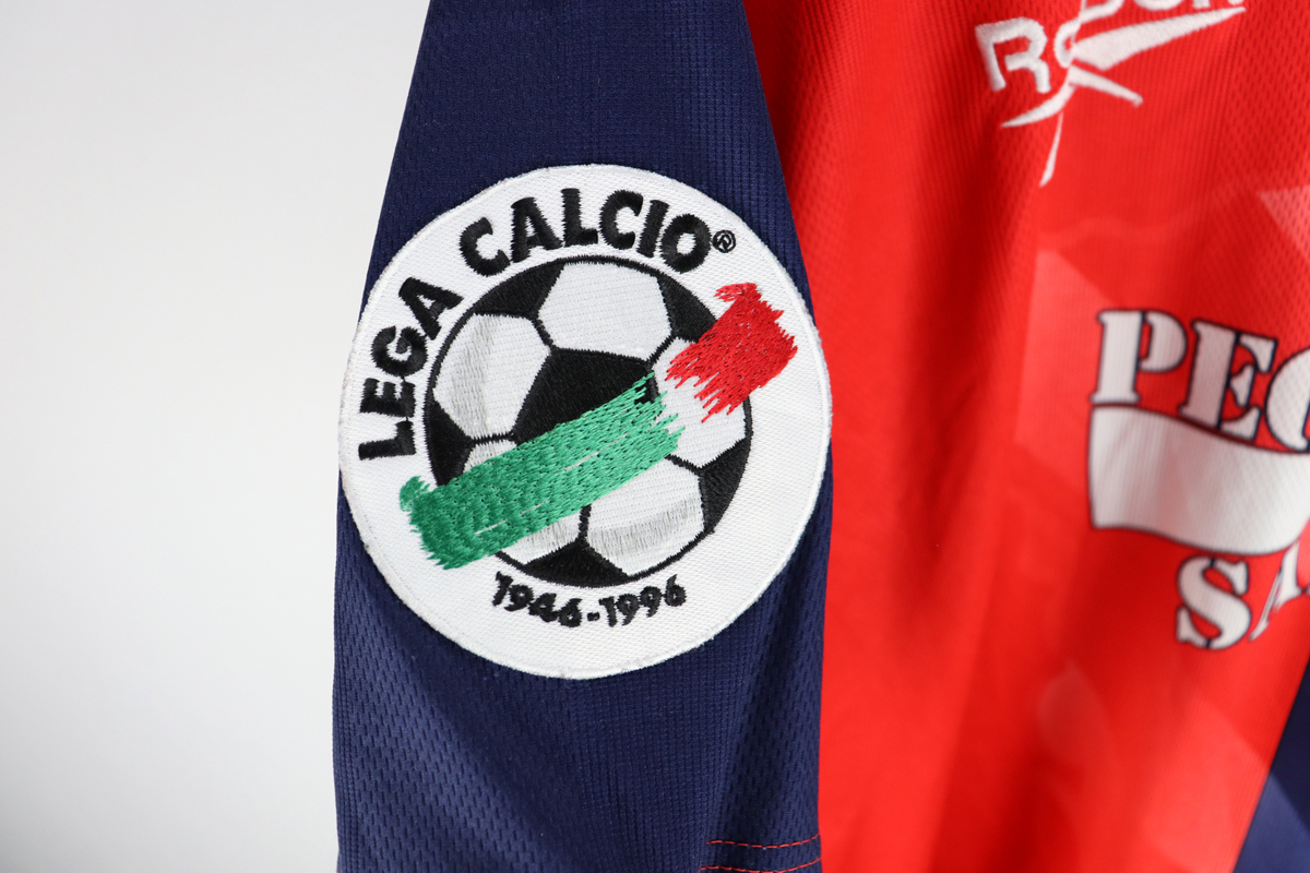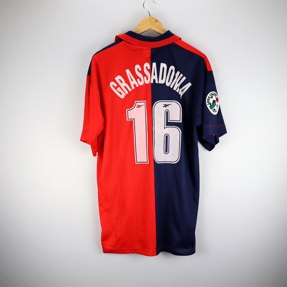 Dettagli: Stemma Cagliari e sponsor tecnico Reebok ricamati. Sponsor Pecorino Sardo stampato nel tessuto. Name set 16 Grassadonia applicato. Maglia graa Cagliari indossata da Gianluca Grassadonia durante il campionato di Serie A 1996-97.