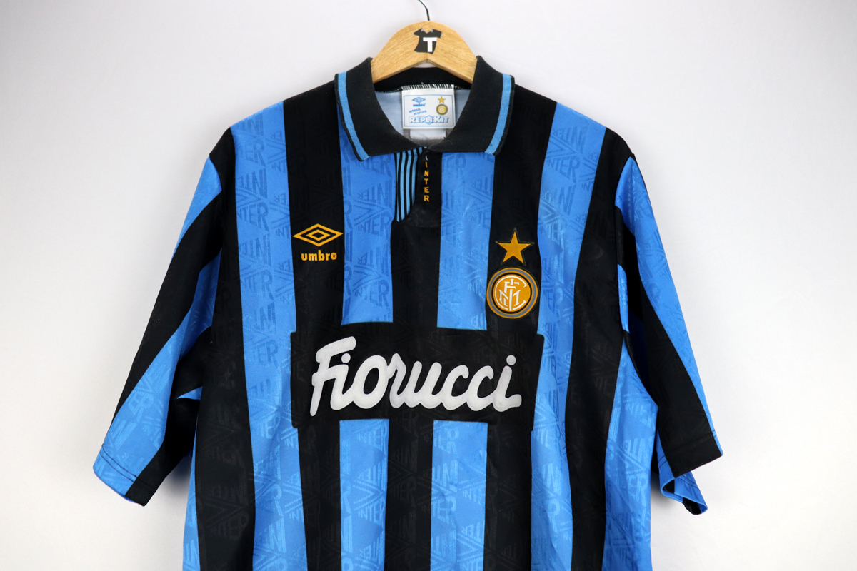 Dettagli: Stemma Inter e sponsor Fiorucci applicati. Logo Umbro stampato nel tessuto. Maglia in eccellenti condizioni. Da ascella ad ascella 60 cm. Lunghezza 79 cm