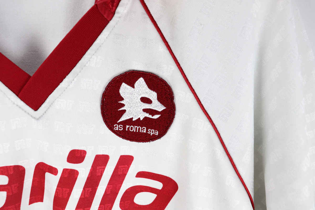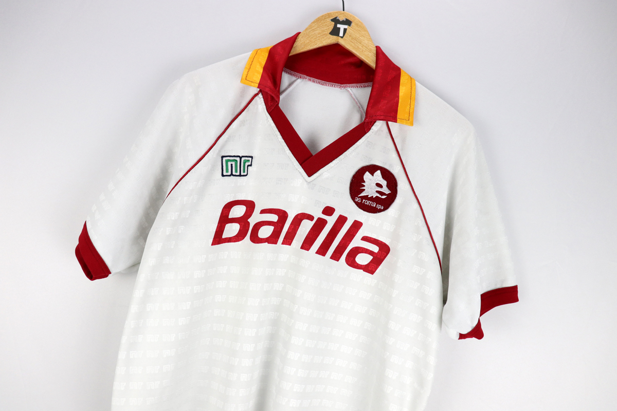 Note: Maglia storica, come quella utilizzata le prime giornate di campionato della stagione 1990/91. Stagione nella quale la Roma vinse la Coppa Italia e raggiunse la finale di Coppa Uefa. Nel quinto anno di fornitura del materiale tecnico la NR finalmente propone nuovi modelli dal disegno più moderno, realizzati in poliestere con numerose varianti. Le maglie indossate estive, sono realizzate sia in tessuto lucido che in tessuto opaco con loghi NR nella trama