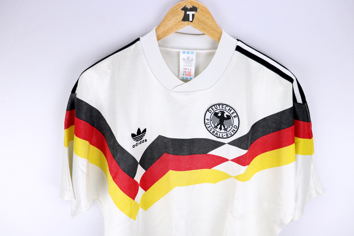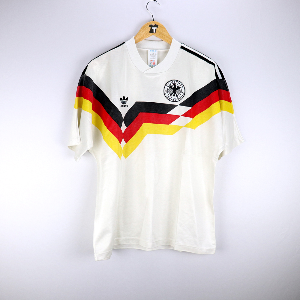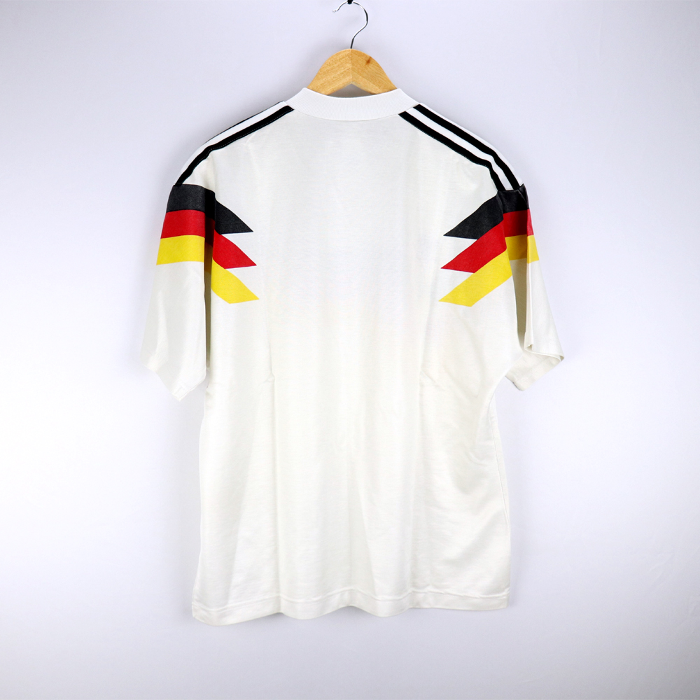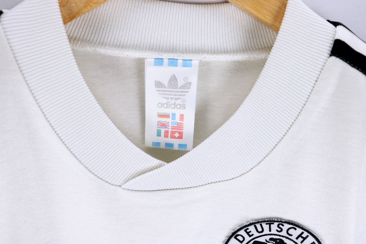 Note: Forse la maglia più bella di tutti i tempi, rarissima e preziosa. Utilizzata dalla Germania negli europei del 1988 e nel mondiale vinto di Italia 90, sconfiggendo in finale l'Argentina di Diego Armando Maradona. Un cult!